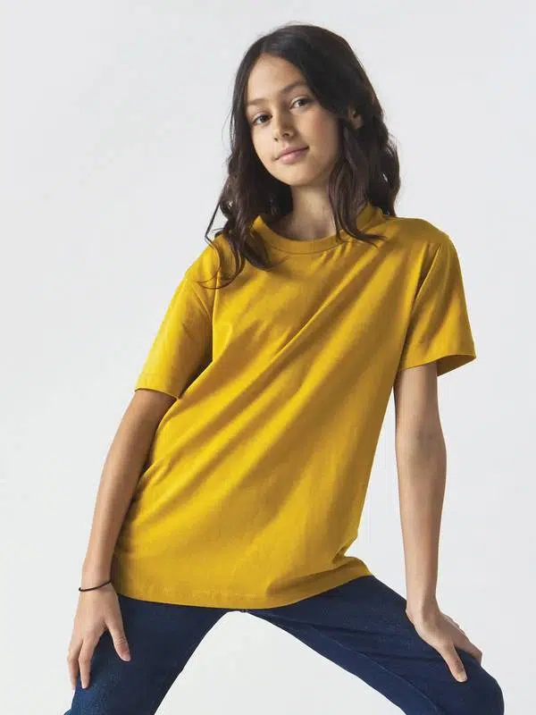 T-shirt bambino manica corta realizzata in cotone pettinato ecosostenibile, girocollo con nastro di rinforzo e morbida bordatura, struttura con cuciture laterali, vestibilità moderna, tessuto morbido trattato ad enzimi. Etichetta taglia tessuta al collo ed etichetta laterale strappabile con logo, composizione e istruzioni di lavaggio.