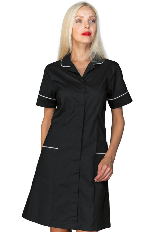 Camice donna Nero Mezza Manica Isacco. Perfetta divisa da lavoro per medico, dottoressa, farmacista o infermiere. Settore medicale, estetico, sanitario, alimentare o camice da lavoro per imprese di servizi. Con collo, maniche e inserto tasche con profilo in contrasto.