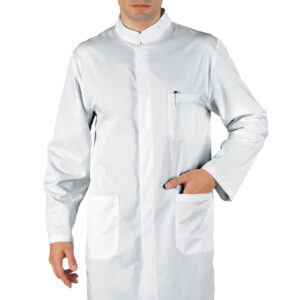 Camice da uomo Davemport a manica lunga bianco. Settore medicale, estetico, sanitario, ospedaliero e industria. Ottima divisa da lavoro per medico, infermiere, farmacista. Bottoni 4 fori con asola. Con collo alla coreana, tasche e taschino al petto.