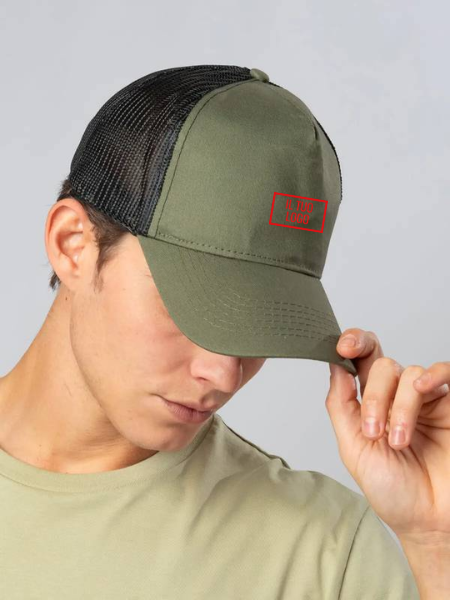 Cappellino a 5 pannelli, mesh posteriore e laterale in poliestere, pannello frontale rinforzato, visiera pre-curvata, chiusura in pvc, ideale per la stampa, 6 cuciture su visiera.