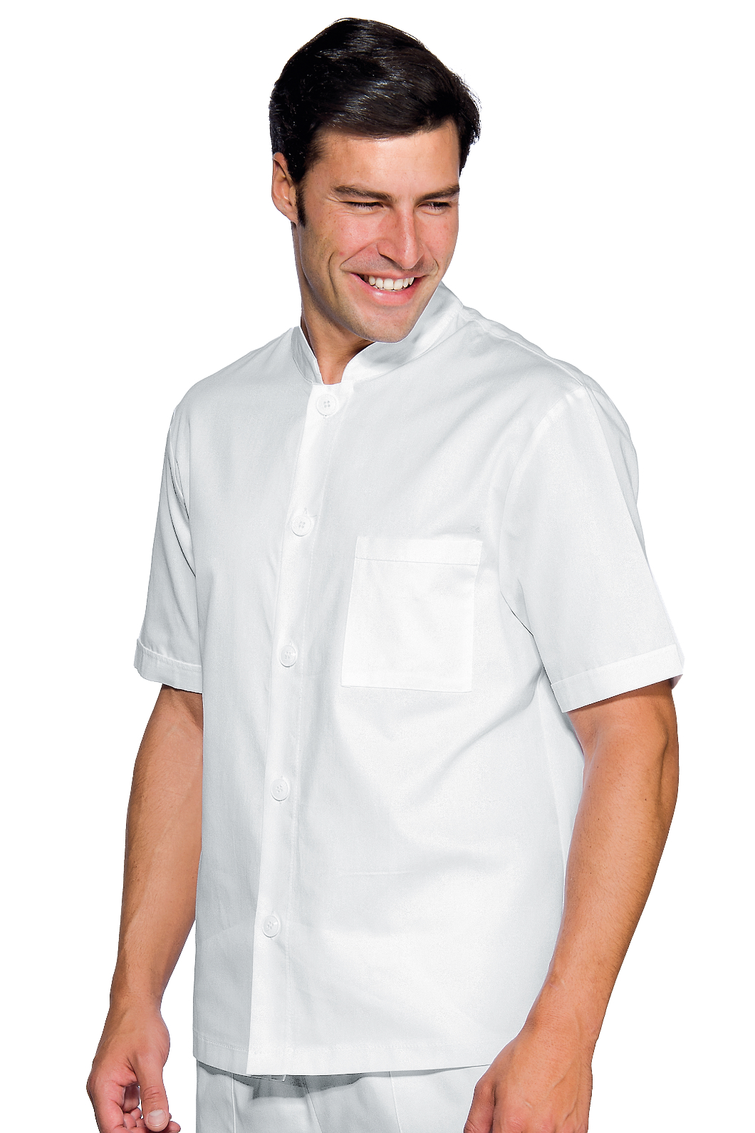Casacca da lavoro per uomo con collo coreano a mezza manica bianco. Settore medicale, estetico, sanitario, ospedaliero, alberghiero e industria. Ottima divisa da lavoro per medico, infermiere e dentista. Anche giacca per pizzaiolo, magazziniere e in cucina.
