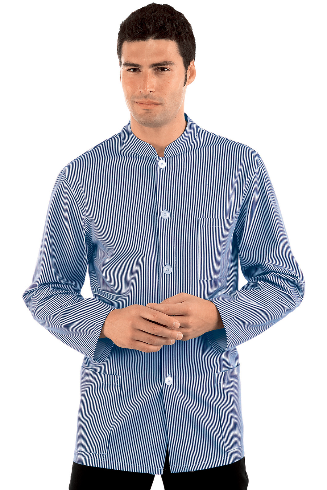 Casacca Coreana a maniche lunghe a righe blu. Ideale per settore alberghiero. divisa da lavoro per facchino, fattorino, ristoranti e catering. Con 2 tasche applicate.