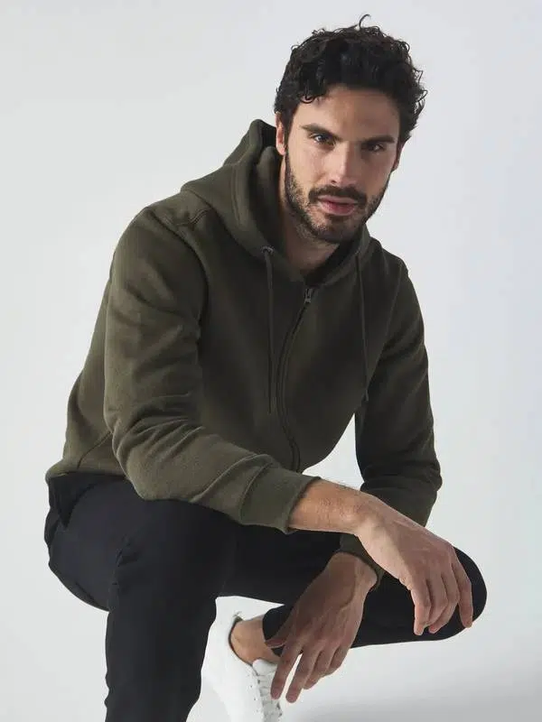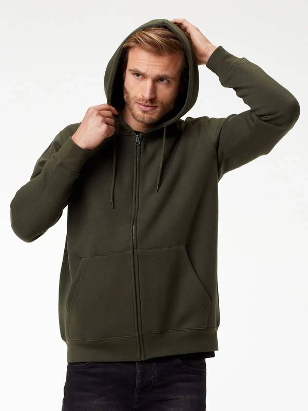 Felpa con cappuccio a doppio strato, felpata internamente, maniche set-in, cerniera tono su tono coperta, occhielli in metallo, cordini con punta in metallo, tasca a marsupio, orlo inferiore e polsini in costina, struttura con cuciture laterali. Etichetta strappabile. Interno in poliestere ed esterno 100% cotone.