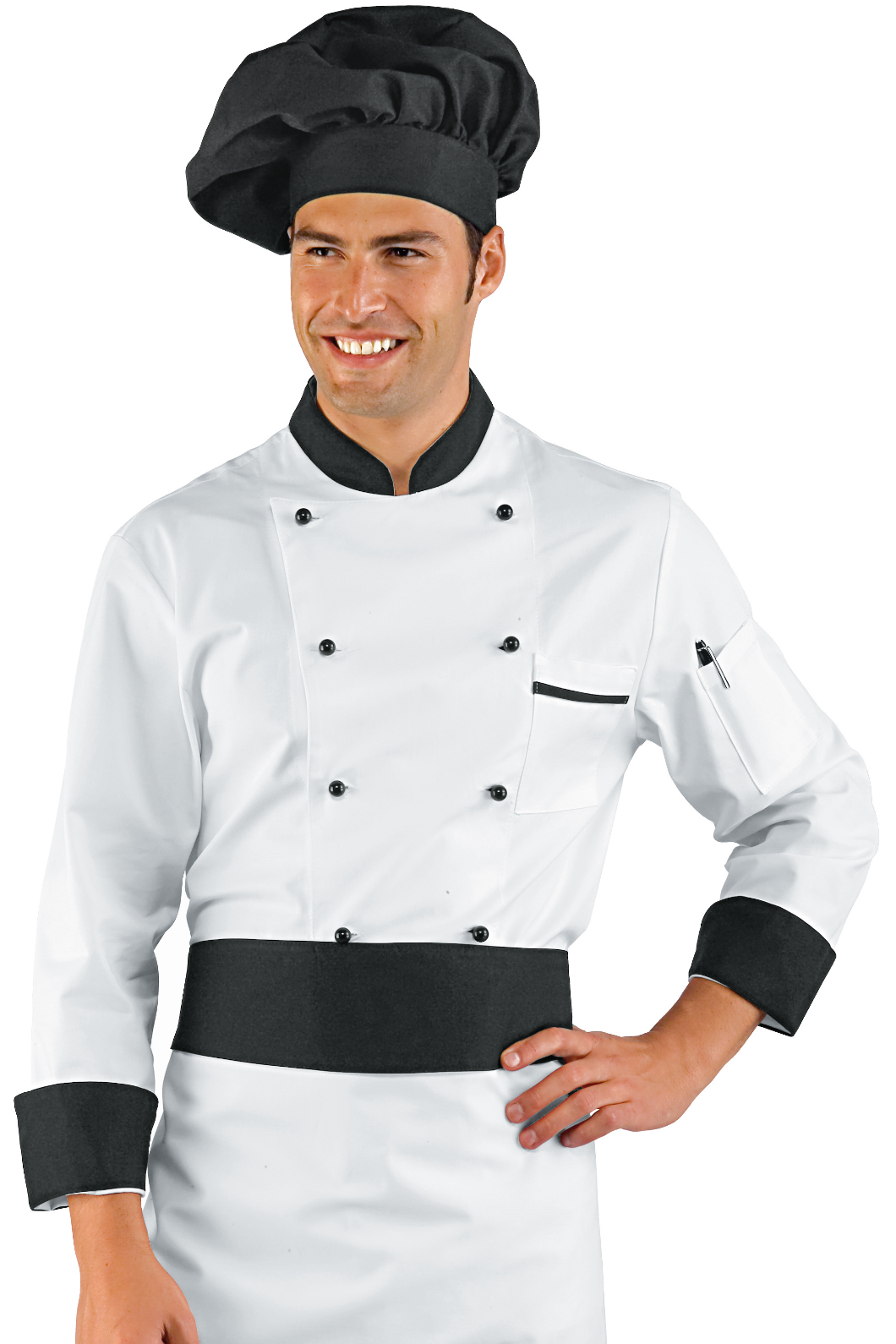 La Giacca da Cuoco con contrasto modello classico unisex a manica lunga bianco e nero. Ideale come divisa per uomo e donna da chef in cucina, ristorante o catering. Taschino al petto e alla manica con allacciatura con bottoni antipanico.