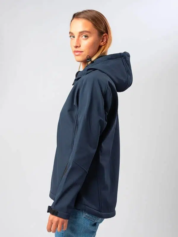 Giacca da donna softshell a 3 strati con cappuccio e girovita regolabili tramite coulisse. Dotata di tasche laterali pratiche e taschino sul petto con zip. Include una zip interna sul lato cuore per facilitare la personalizzazione. Tirazip in plastica, polsini regolabili con velcro e interno in morbido micropile. Dettagli in contrasto, come zip, tirazip e coulisse neri. Impermeabilità 8000 mm, traspirabilità 1000 gr/m². Etichetta removibile.