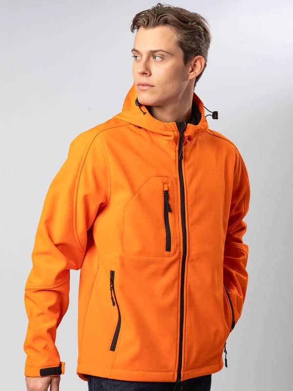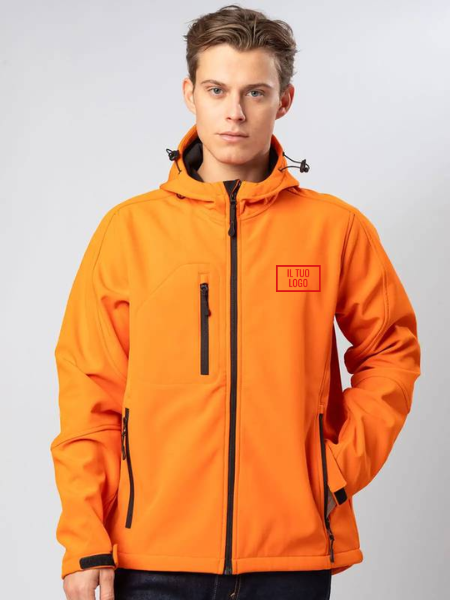 Giacca in softshell a 3 strati, cappuccio con fermi in plastica, occhielli e cordino neri. Due tasche laterali con zip, una taschino sul petto con zip, tirazip in plastica, zip interna lato cuore per la personalizzazione, polsini regolabili con velcro, interno in micropile. Bordo inferiore con cordino regolabile con fermi.Impermeabilità 8000 mm, traspirabilità 1000 gr/m2. Etichetta strappabile.