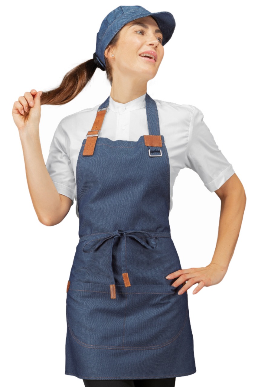 Grembiule Pettorina Kansas Short jeans. Ottimo Per settore alberghiero e parannanza per ristorazione in cucina. Divisa da lavoro per bar, pub, ristoranti, alimentari, cucine, enoteche e catering. Con tasca centrale.