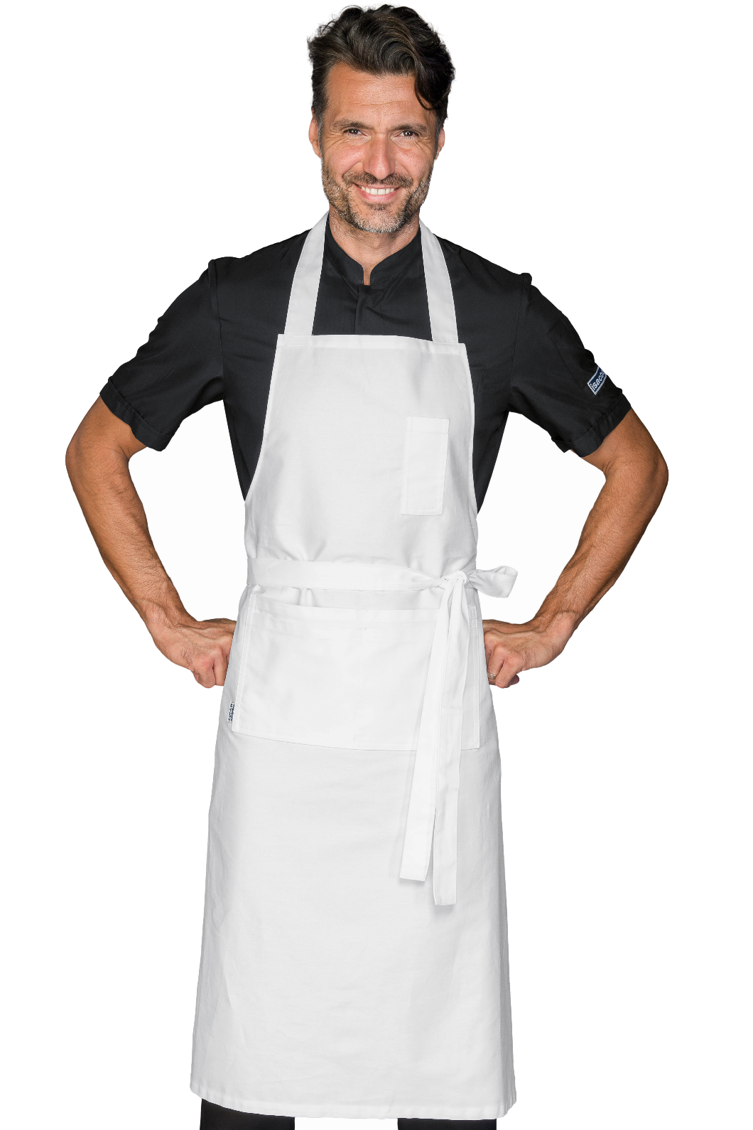 Grembiule Pettorina Bombay bianco cm 100×105 extra large con tascone centrale Isacco. Ottimo per settore alberghiero e parannanza per ristorazione in cucina. Divisa da lavoro per bar, pub, ristoranti, alimentari, cucine, enoteche e catering. Con robusti ed eleganti lacci in tessuto.