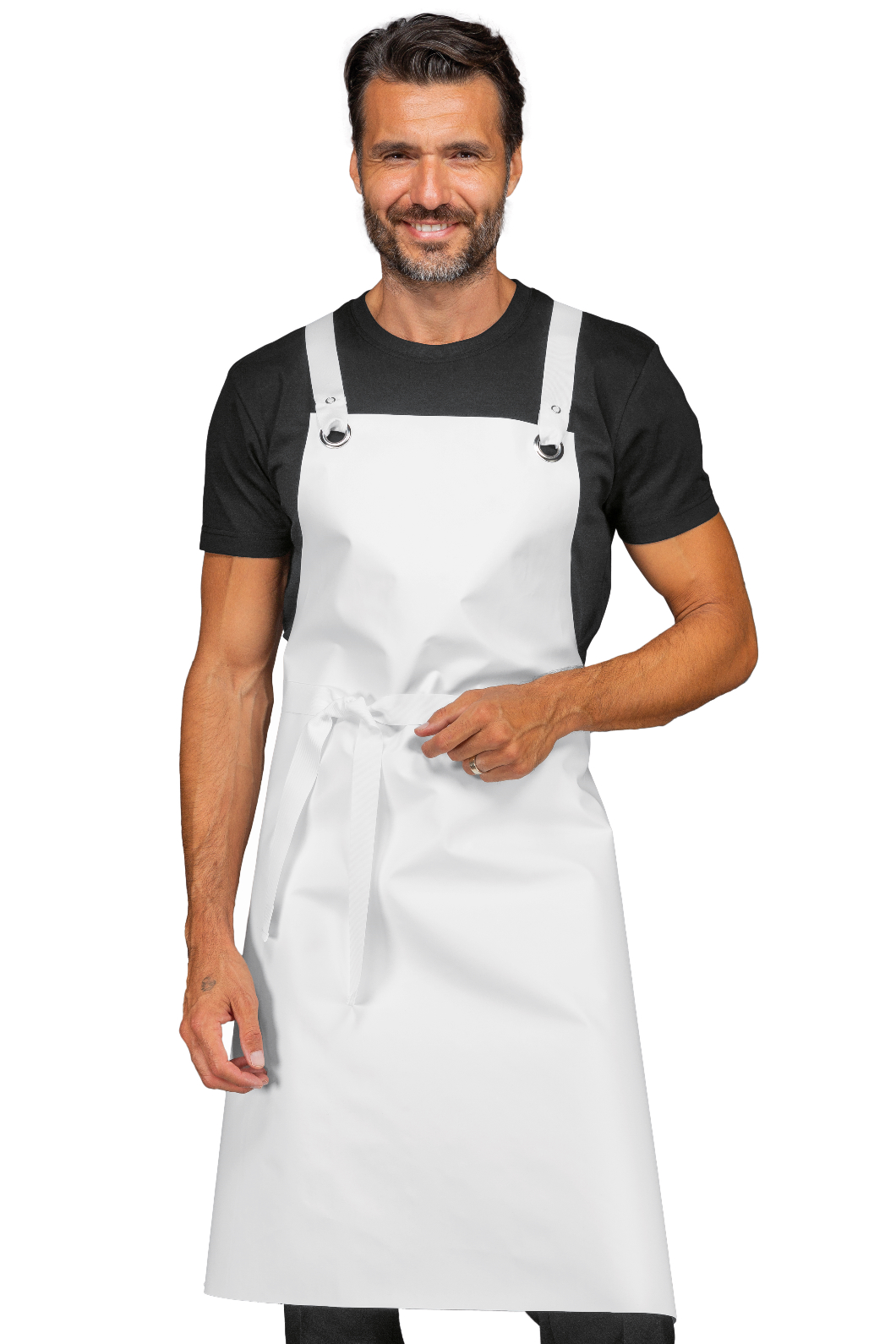 Grembiule Pettorina Cerato Ring senza tasca bianco. Ideale per settore alberghiero e parannanza per ristorazione e negozi alimentari (macelleria). Con fibbie e lacci lunghi 90 cm in tessuto.