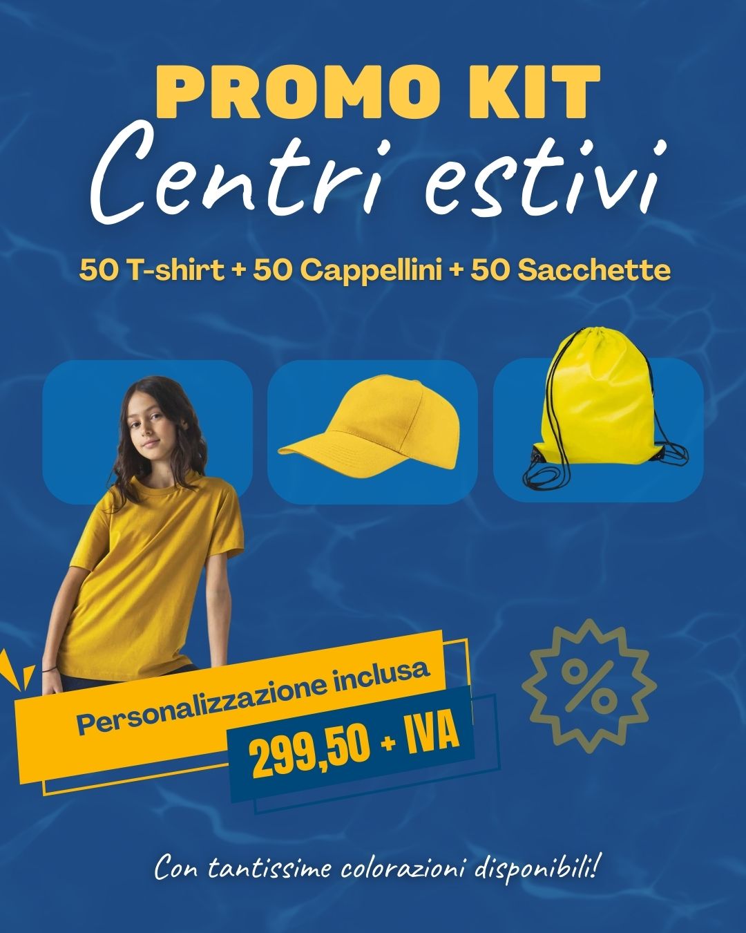 Ogni kit comprende 50 T-Shirt Bambino + 50 Cappellini + 50 Sacchette.